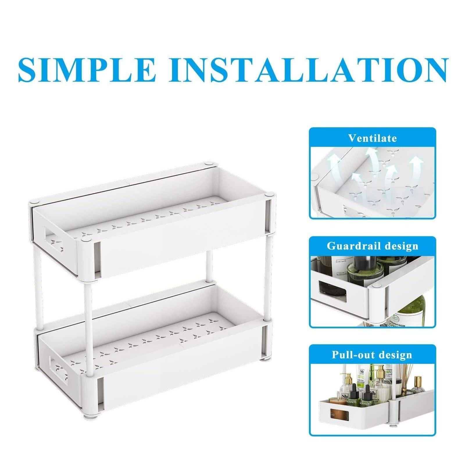 Multi-Functional Under Sink Organizer: This upgraded sliding bathroom organizer can be easily placed under almost all sinks or on any countertop in the kitchen, bathroom or dresser,which can meet the storage needs of most items.Can be used as under sink organizers, bathroom storage, cosmetic storage, etc.Wisdom Star bathroom sink shelf basket improves space utilization for your house perfectlyUnique Design: Bathroom organizer under sink provides layers of pull-out design. Not only easy sliding but also pull out shelves can’t come off when pulling horizontally. It adopts beautiful hollow design good for drainage and is more hygienic and easy to clean. Coming with 4 extra hooks, deliverying a better organizing and storing performanceMaterial: The under sink organizers is made of plastic material, good rust resistance. Kitchen drawer organizer has a very good structure and solid frame, with enough bearing capacity.The Wisdom Star cabinet organizers is the best choice for youEasy to Install: Easy to assemble and disassemble, and included installation guide. Stable and non-slip, no drilling, there is no need to drill holes in your delicate cabinetPerfect Size: 8.46'W x 15.5'D x 12.8'H, which is suitable for most under sink cabinetsProducts and assembly parts