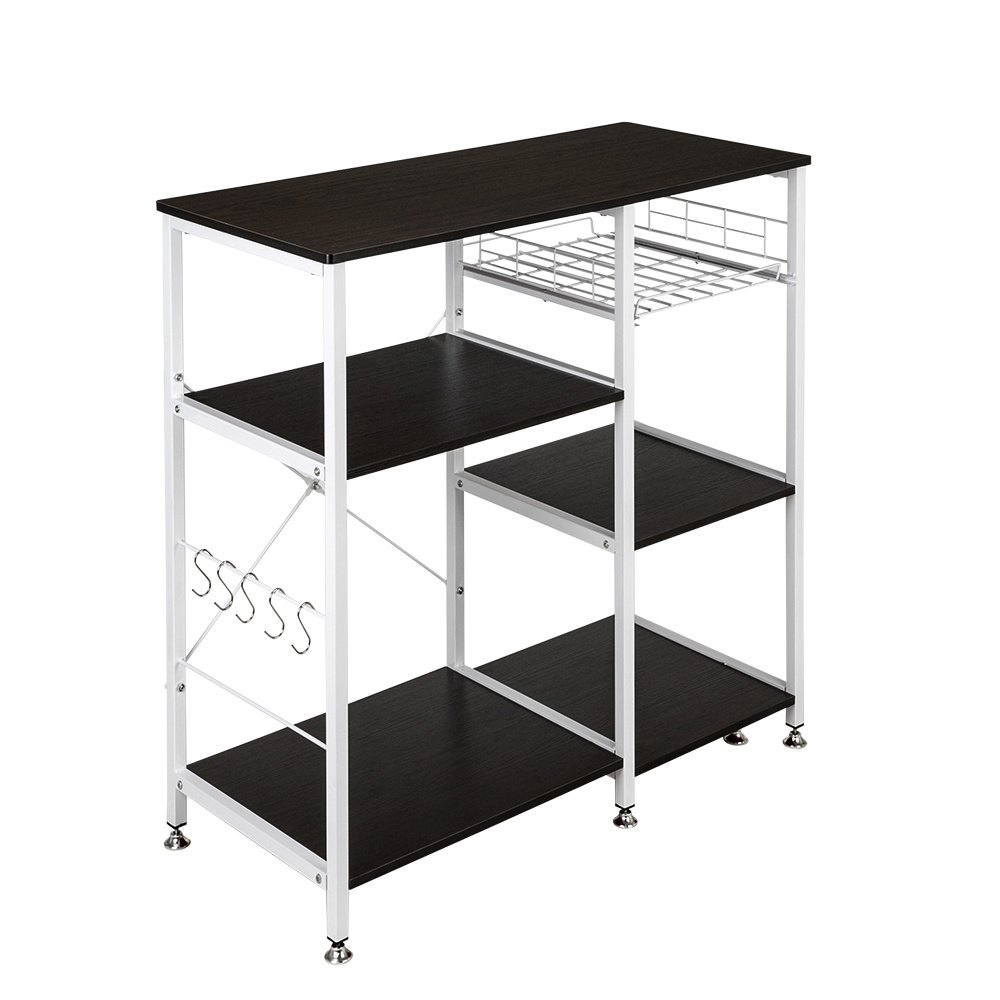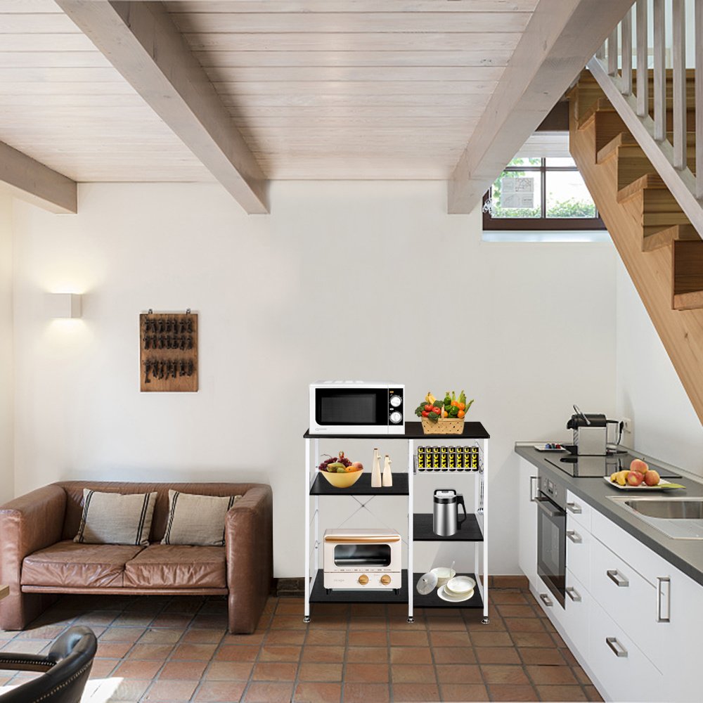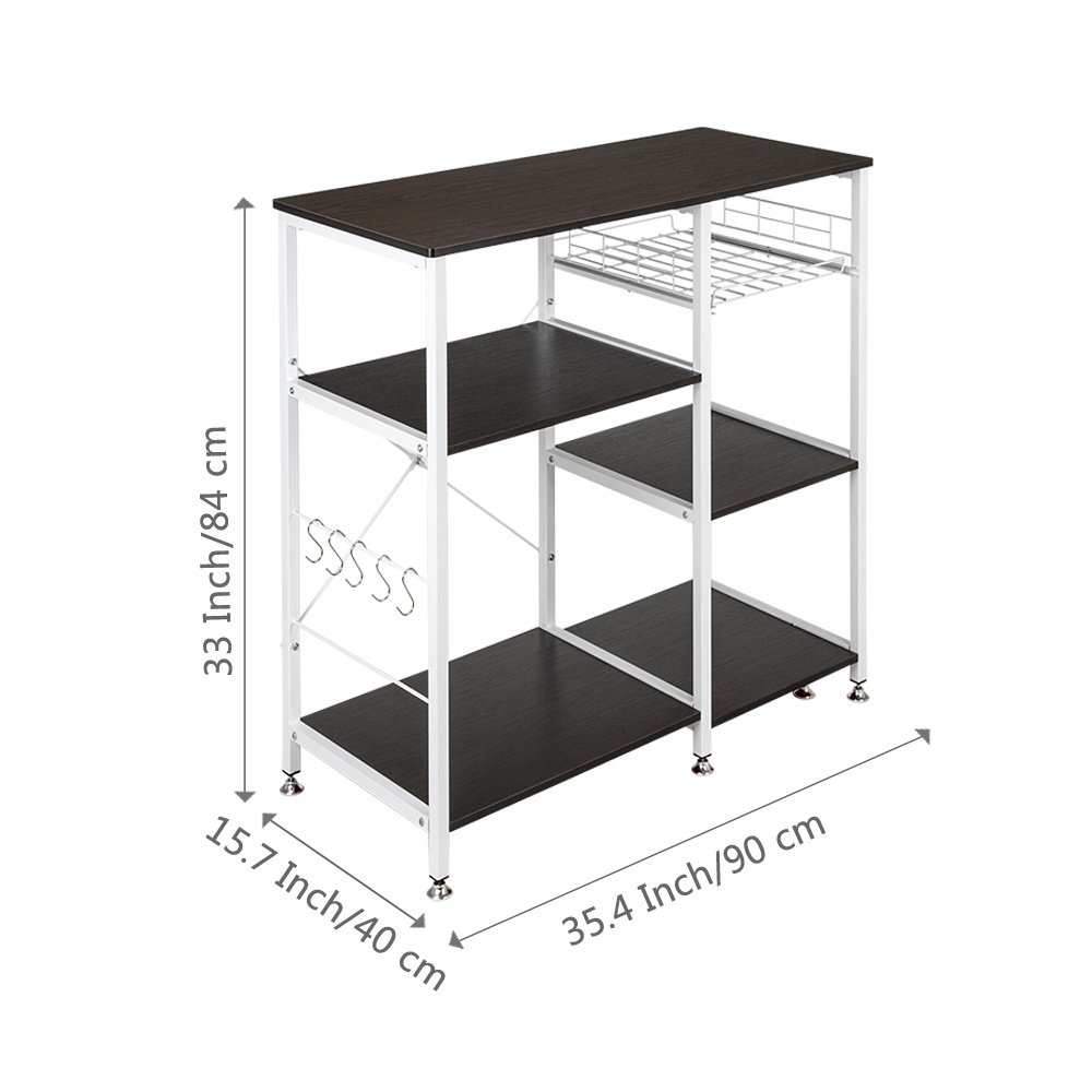 Introductions:Microwave Standing 35.5" 3-Tier 3-Tier Microwave Stand Storage Kitchen Oven Baker's Rack Workstation Shelf; Modern; Simple & Elegant. A perfect storage rack for your home; ideal for keeping things shipshape and saving space of your kitchen.Features:1. Perfect As A Kitchen Baker's Rack; Microwave Oven Stand; Kitchen Storage Shelf; Spice Rack Organizer; Baker's Rack; Microwave Stand; Kitchen Workstation Shelf; Office Storage Rack. Fitting In Home & Kitchen2. Extra Basket Can Store Fruits And Vegetables Or Some Small Kitchen Necessities3. Five Little Hooks Make It Easier To Hang Cooking Tools Like Pots; Pans; Utensils And Etc4. Round Corner Design Is More Elegant And Safe To Use5. Adjustable Leg Pads Design To Adjust 1-2cm Lengths Of The Legs; Keep The Rack Stable Even On Uneven Floor6. Provides Large Storage Space7. Set With 3-Tier 3-Tier You Can Store Toaster; Spice; Dishes; And Any Other Things You Want8. Beautiful MDF Board; Metal Frame With Smooth Surface; Easy To Clean; Anti-Scratch And Anti-Skidding9. Back x Shape Frame Utilizes Heavy-Duty And Powder-Coated Metal Materials; Which Ensures Stability And Durability10. Modern Simple Fashion; Fits All Different Indoor Environment