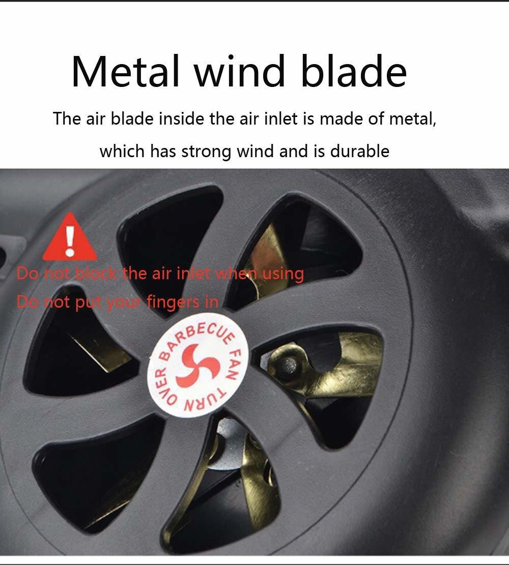 Our BBQ blower is made of plastic body and metal air outlet; which has good impact resistance and heat resistance; not easy to damage; not easy to rust; and can withstand more force. In addition; the inside of the blower is made of high-quality stainless steel; and the metal gears are smoother and more durable than plastic gears.